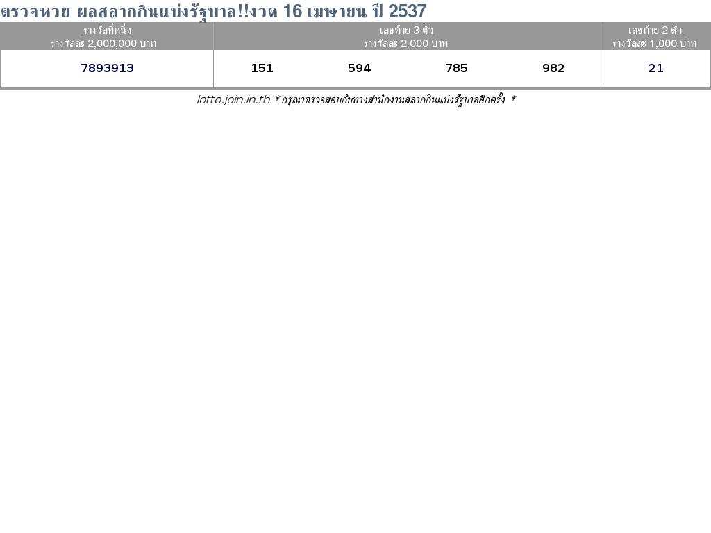 ตรวจผลสลาก 16/04/2537 ตรวจผลสลากกินแบ่ง, ตรวจผลสลากกินแบ่งรัฐบาล, ตรวจรางวัลสลากกินแบ่งรัฐบาล, ตรวจหวยออนไลน์, สลากกินแบ่งรัฐบาล 16 เมษายน 2537 สลากกินแบ่งรัฐบาลปี 2537, เช็คหวย ตรวจหวย 16-4-37 ตรวจผลสลากกินแบ่งรัฐบาล 16/4/37 หวยออกอะไร มาลุ้นกันได้เลยที่นี่ lotto.join.in.th