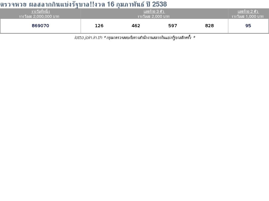 ตรวจหวย ตรวจผลสลากกินแบ่งรัฐบาล 16 กุมภาพันธ์ 2538 ใบตรวจหวย 16/2/38