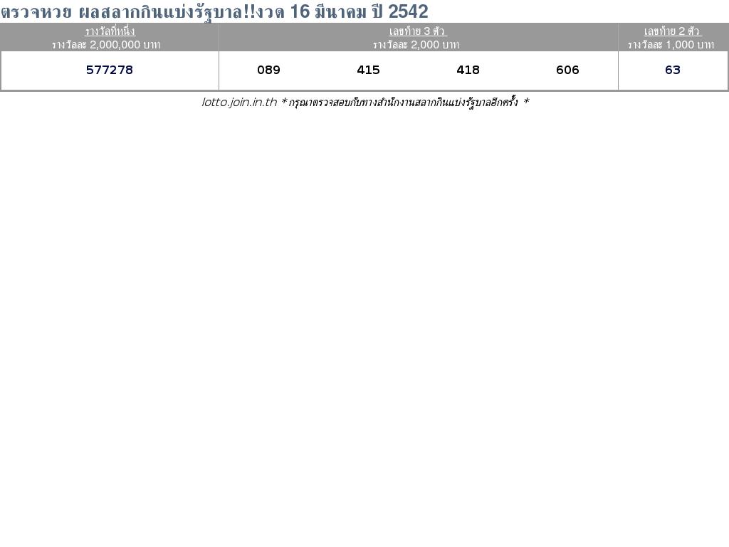 ตรวจหวย ตรวจผลสลากกินแบ่งรัฐบาล 16 มีนาคม 2542 ใบตรวจหวย 16/3/42