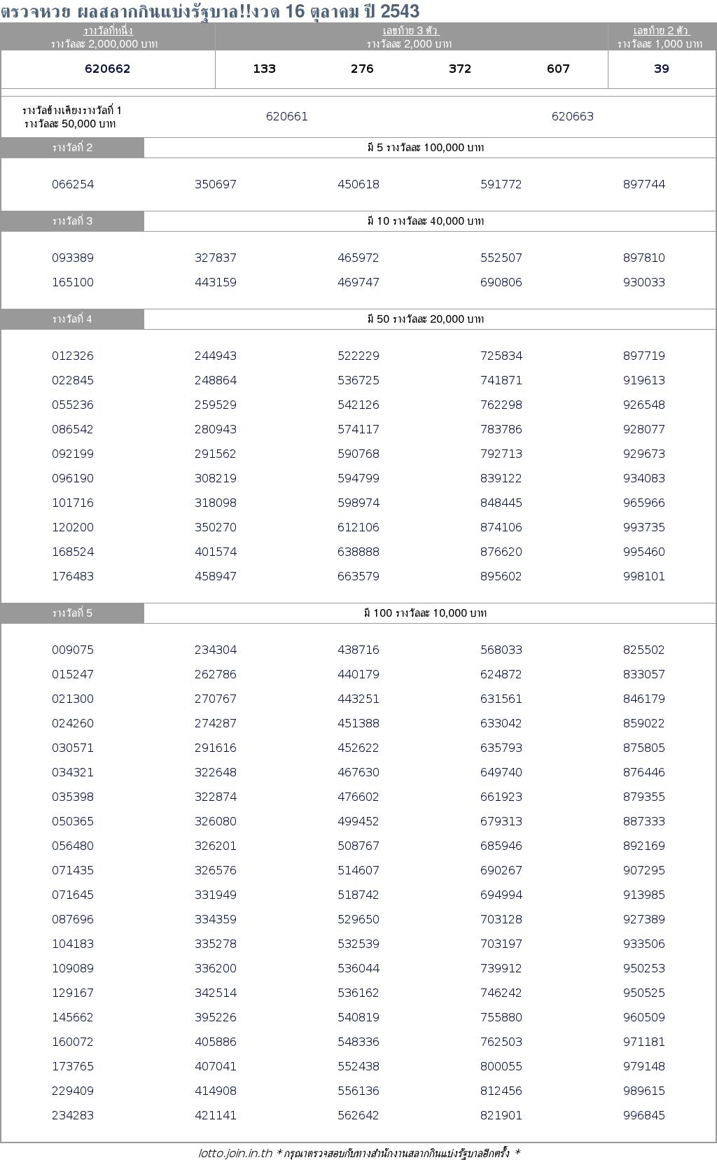 ตรวจหวย ตรวจผลสลากกินแบ่งรัฐบาล 16 ตุลาคม 2543 ใบตรวจหวย 16/10/43
