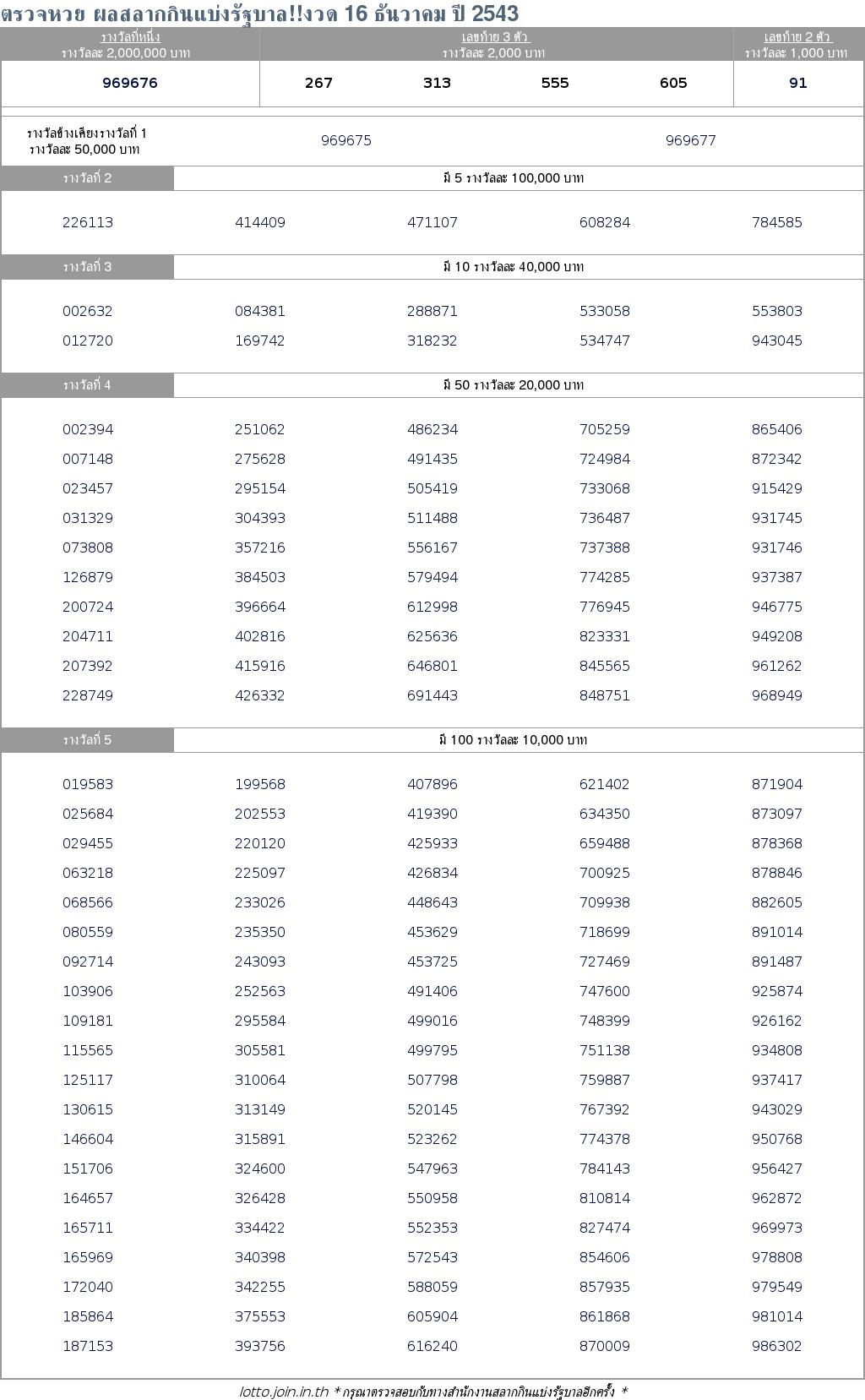 ตรวจหวย ผลสลากกินแบ่งรัฐบาล!!งวด 16 ธันวาคม ปี 2543