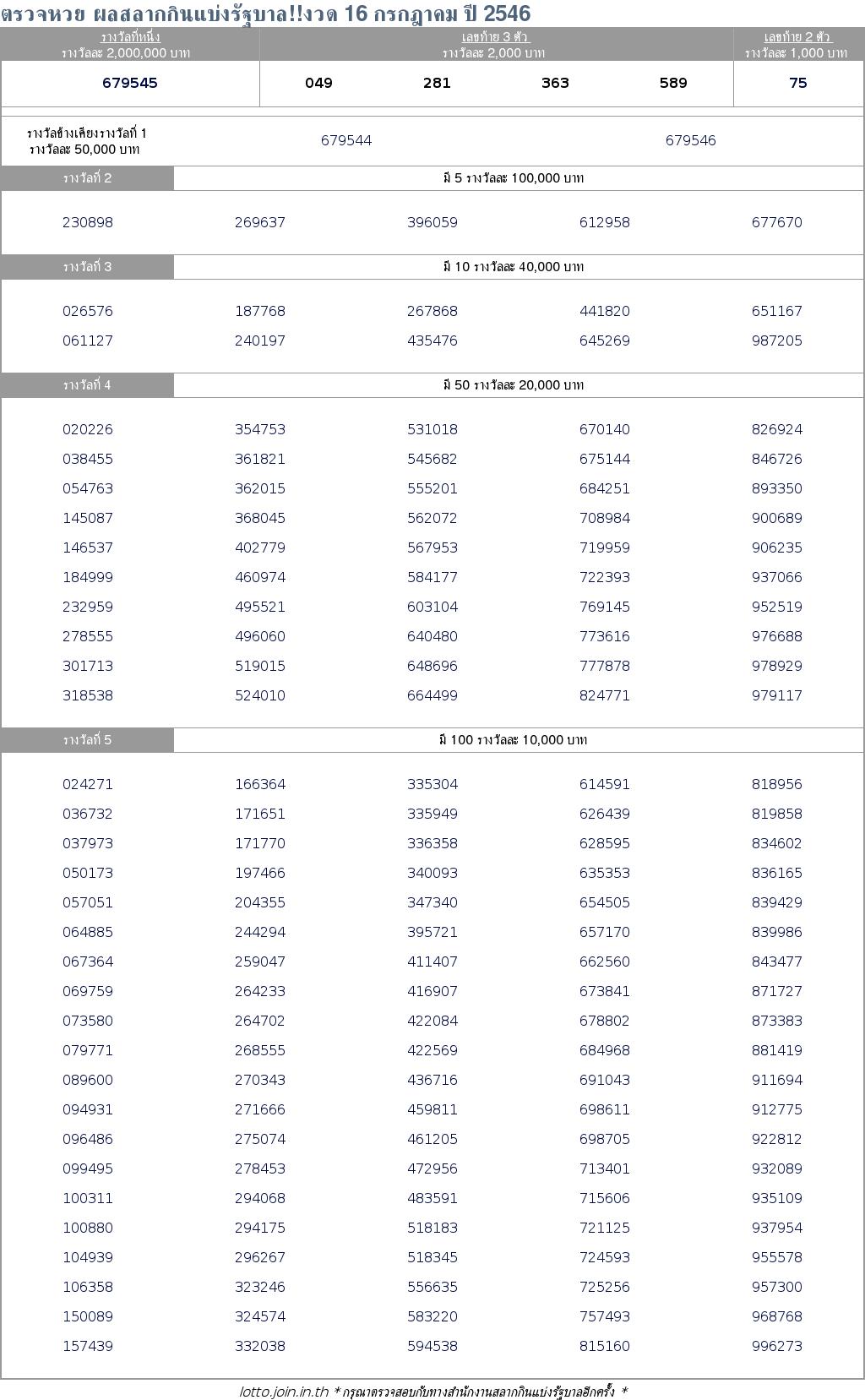 ตรวจหวย ผลสลากกินแบ่งรัฐบาล!!งวด 16 กรกฎาคม ปี 2546