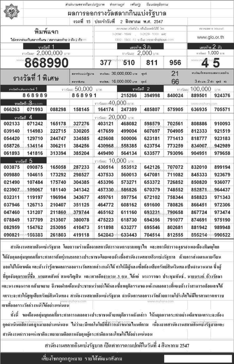 ตรวจหวย ตรวจผลสลากกินแบ่งรัฐบาล 02 สิงหาคม 2547 ใบตรวจหวย 02/8/47