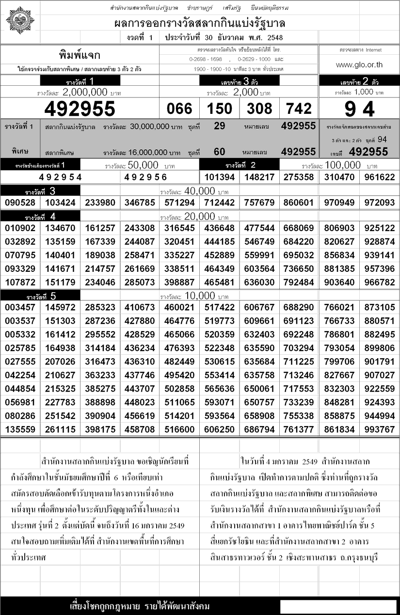 ตรวจหวย ผลสลากกินแบ่งรัฐบาล!!งวด 30 ธันวาคม ปี 2548