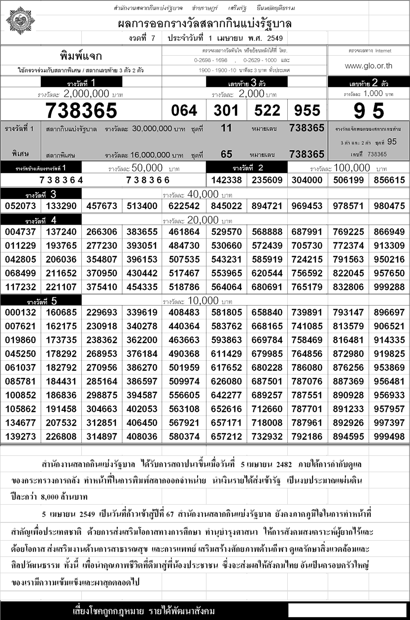 ตรวจหวย ผลสลากกินแบ่งรัฐบาล!!งวด 1 เมษายน ปี 2549