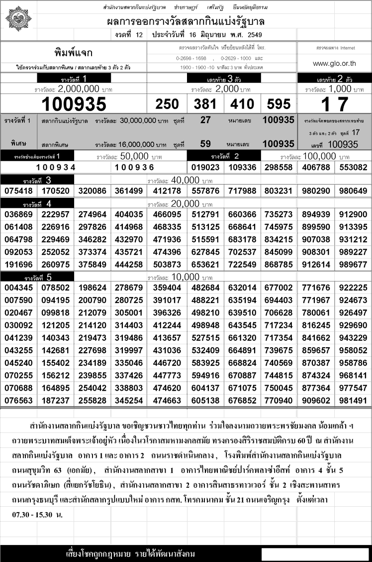 ตรวจหวย ผลสลากกินแบ่งรัฐบาล!!งวด 16 มิถุนายน ปี 2549