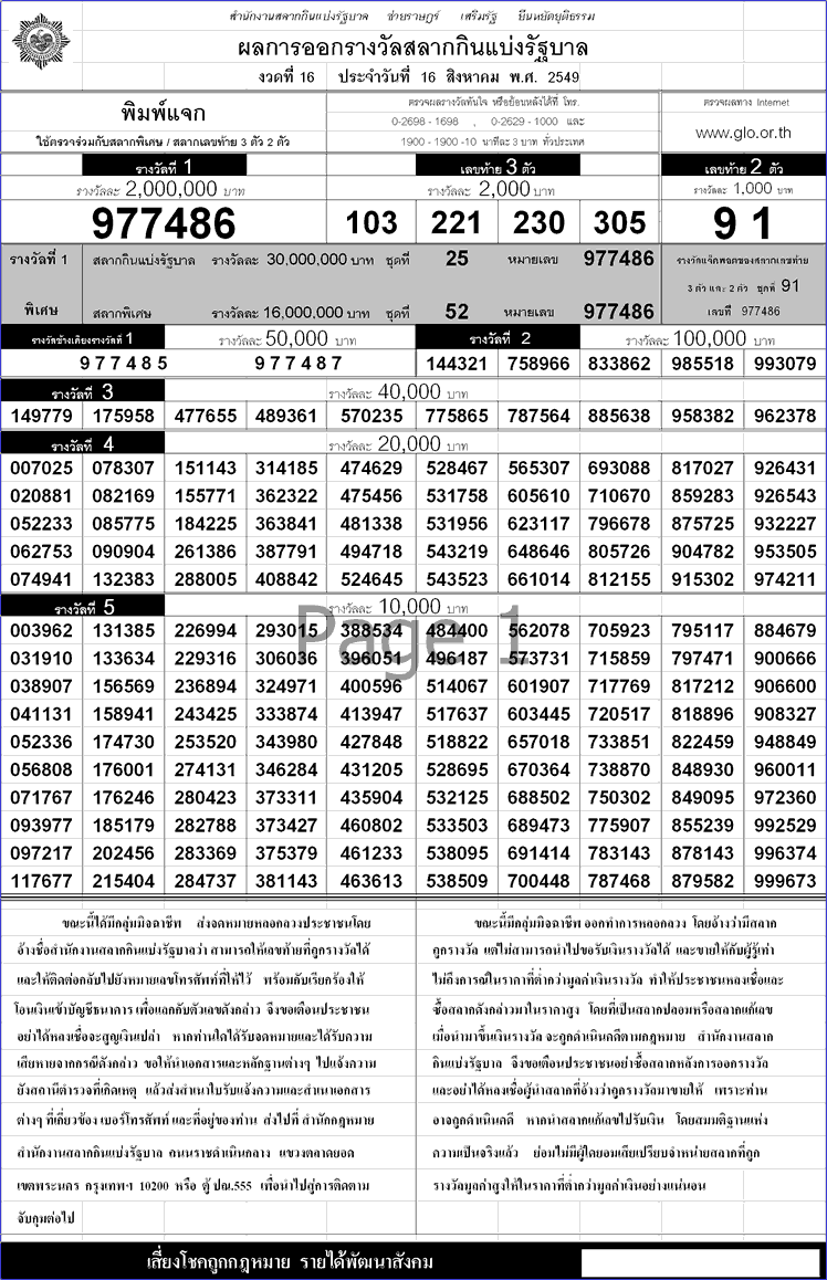 ตรวจหวย ผลสลากกินแบ่งรัฐบาล!!งวด 16 สิงหาคม ปี 2549