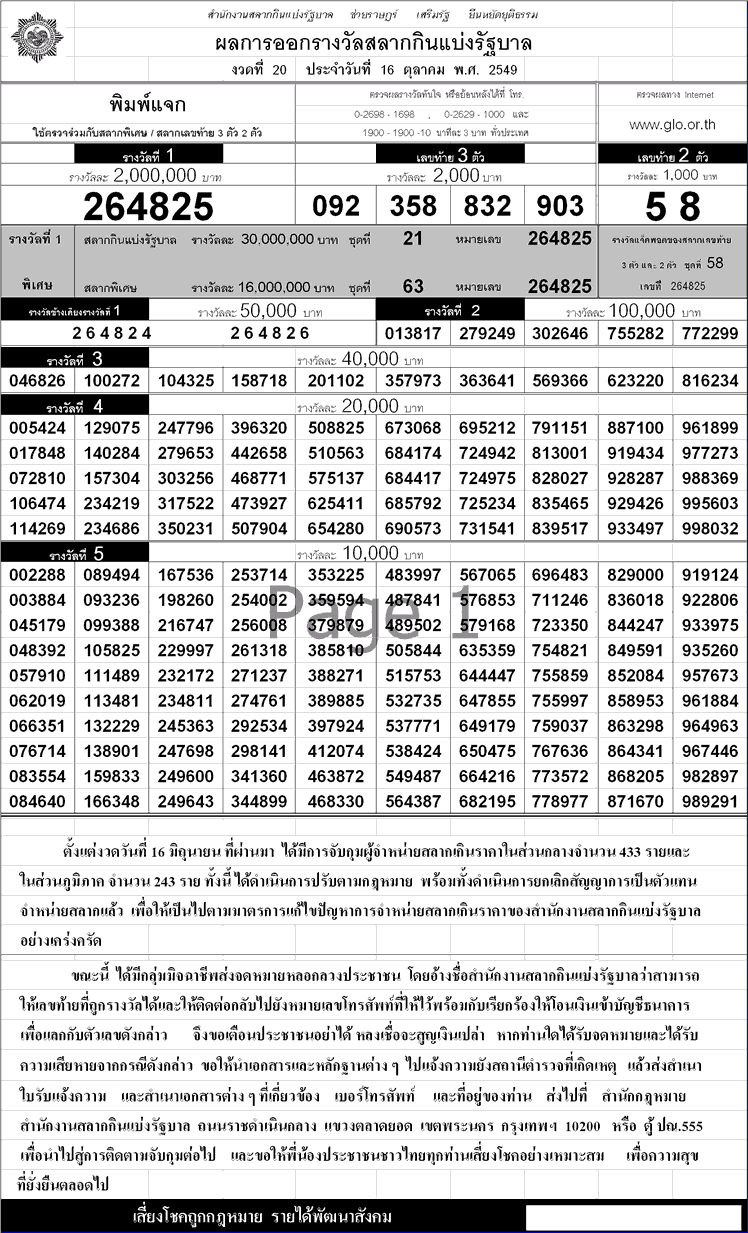 ตรวจหวย ผลสลากกินแบ่งรัฐบาล!!งวด 16 ตุลาคม ปี 2549