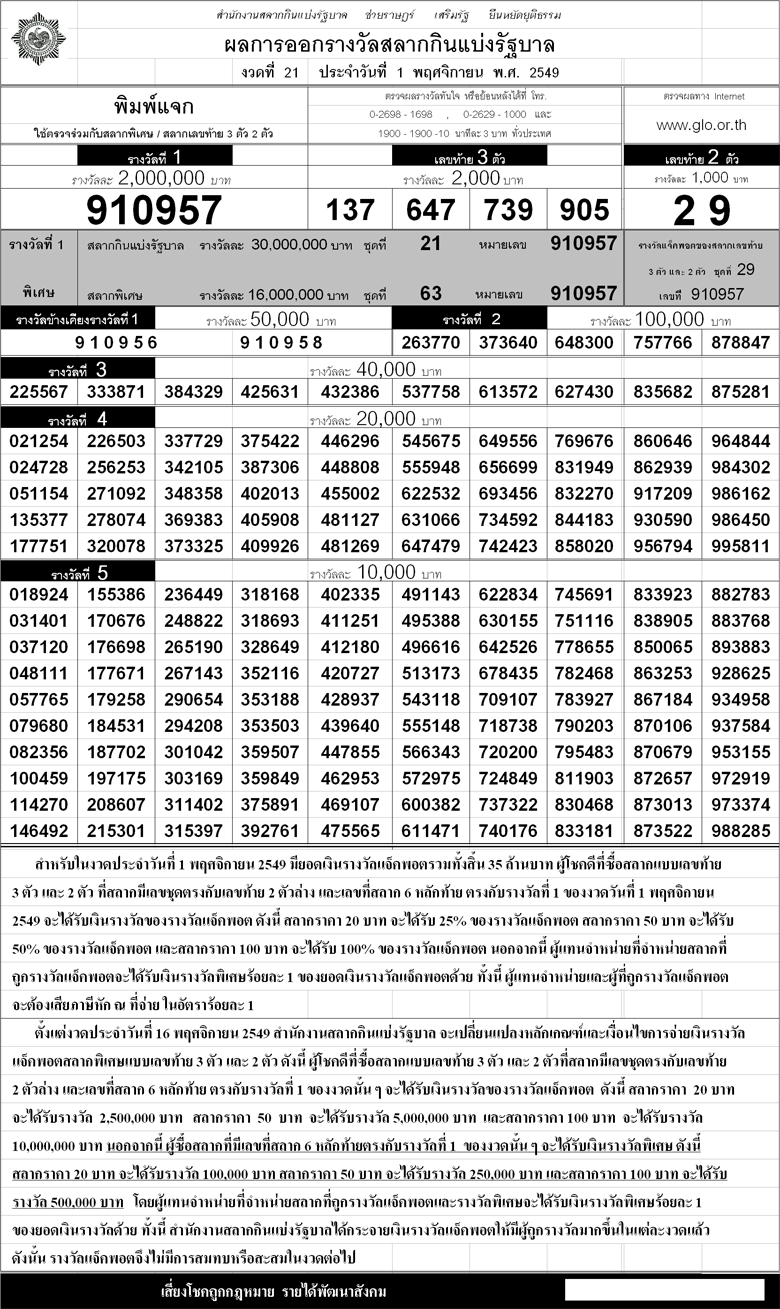 ตรวจหวย ผลสลากกินแบ่งรัฐบาล!!งวด 1 พฤศจิกายน ปี 2549