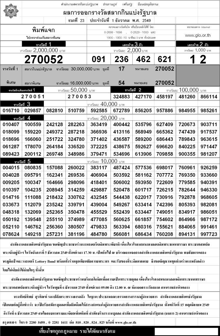 ตรวจหวย ผลสลากกินแบ่งรัฐบาล!!งวด 1 ธันวาคม ปี 2549