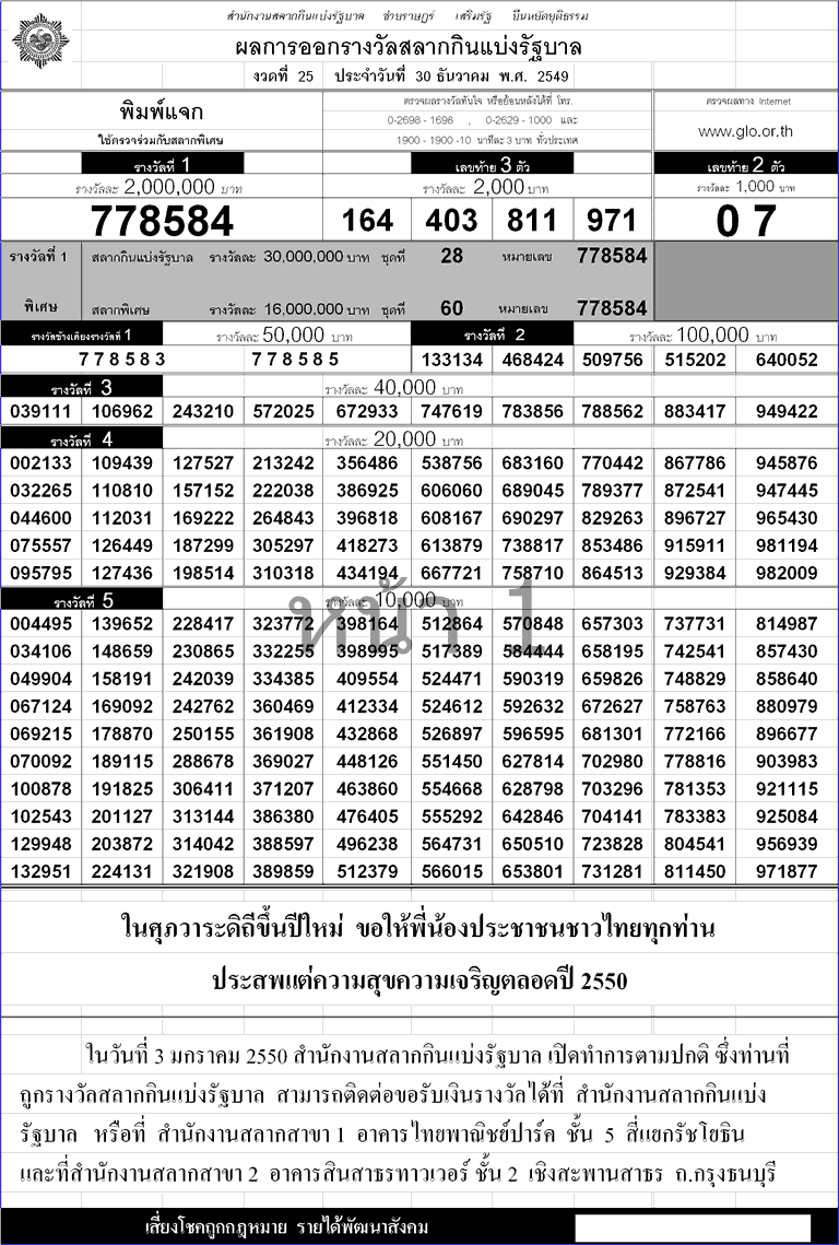 ตรวจหวย ผลสลากกินแบ่งรัฐบาล!!งวด 30 ธันวาคม ปี 2549