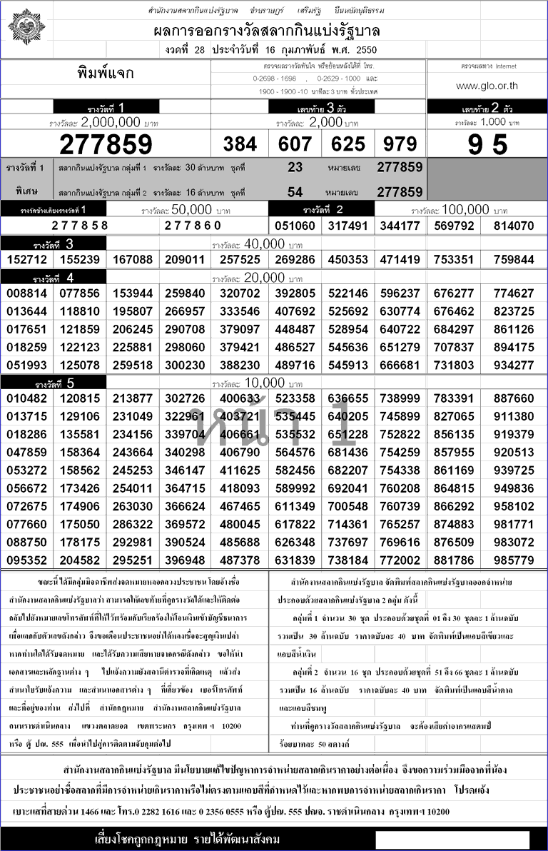 ตรวจหวย ผลสลากกินแบ่งรัฐบาล!!งวด 16 กุมภาพันธ์ ปี 2550