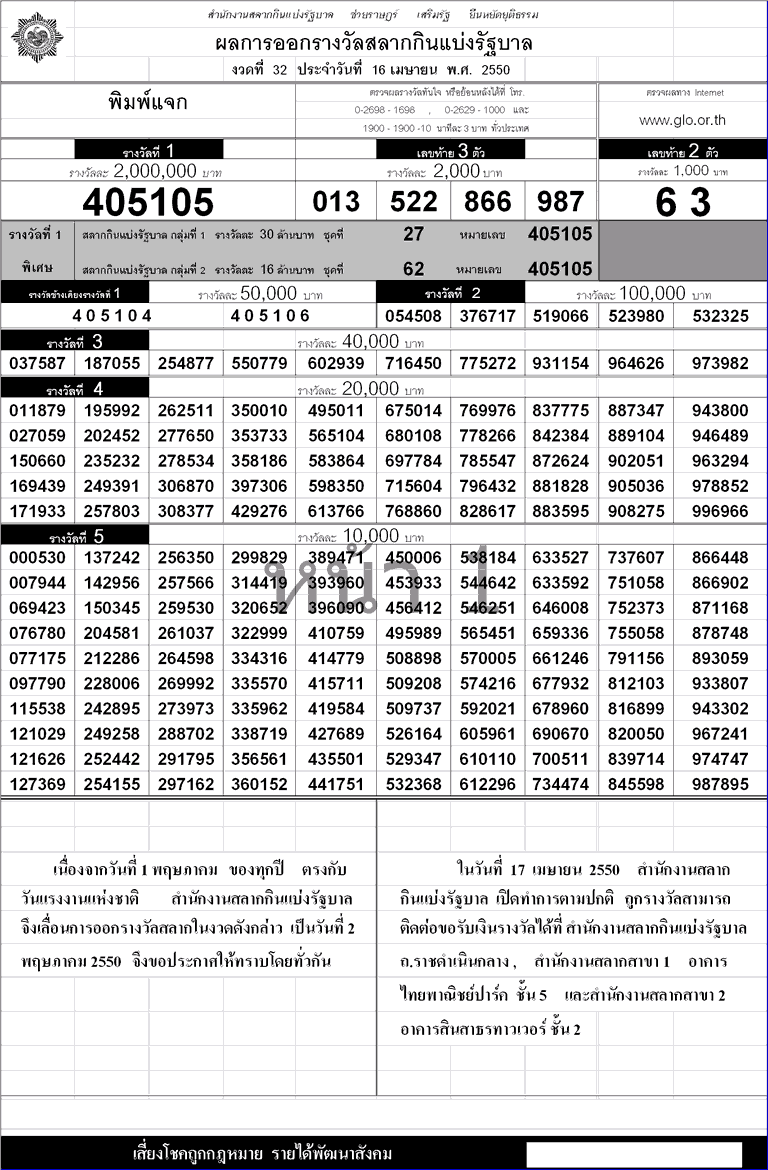 ตรวจหวย ผลสลากกินแบ่งรัฐบาล!!งวด 16 เมษายน ปี 2550