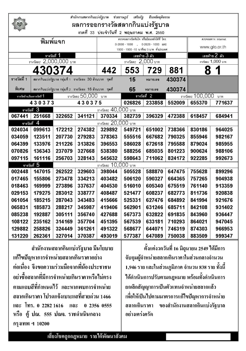 ตรวจหวย ผลสลากกินแบ่งรัฐบาล!!งวด 02 พฤษภาคม ปี 2550