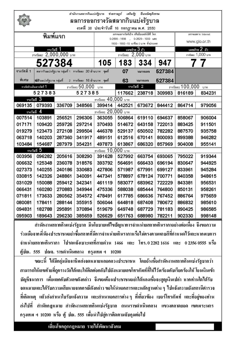 ตรวจหวย ผลสลากกินแบ่งรัฐบาล!!งวด 16 กรกฎาคม ปี 2550