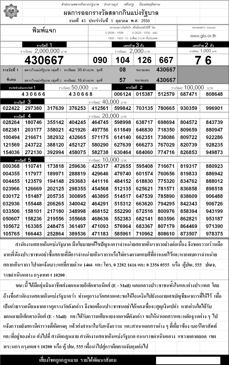ตรวจหวย ผลสลากกินแบ่งรัฐบาล!!งวด 1 ตุลาคม ปี 2550