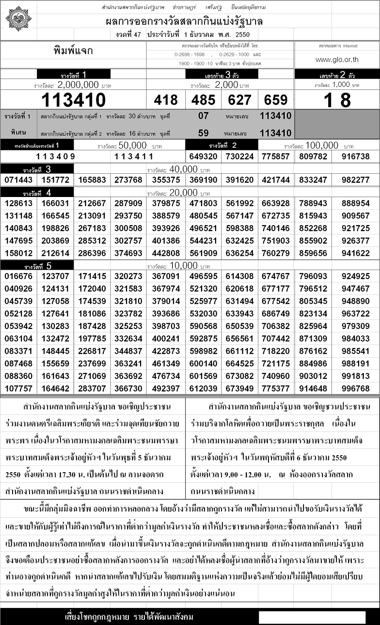 ตรวจหวย ผลสลากกินแบ่งรัฐบาล!!งวด 1 ธันวาคม ปี 2550