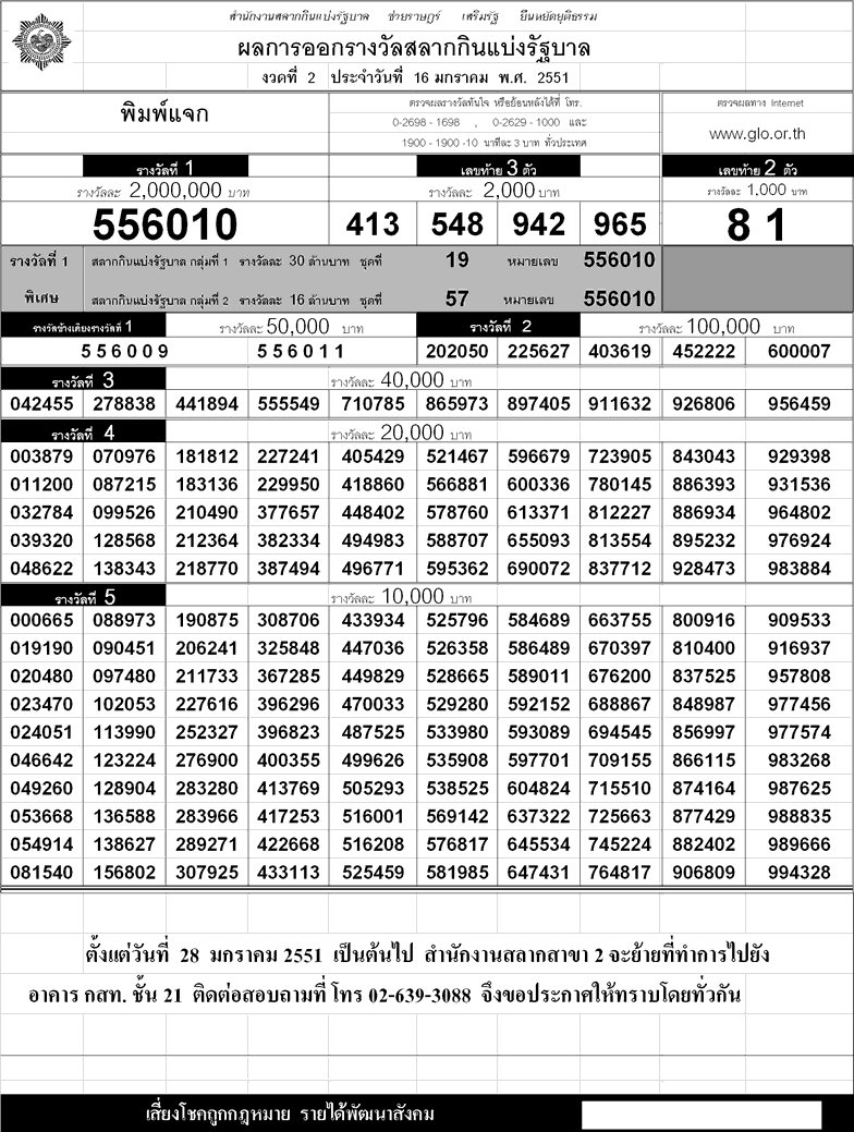 ตรวจหวย ผลสลากกินแบ่งรัฐบาล!!งวด 16 มกราคม ปี 2551