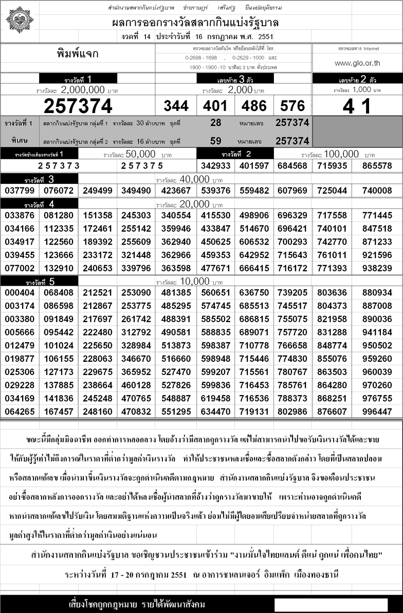 ตรวจหวย ผลสลากกินแบ่งรัฐบาล!!งวด 16 กรกฎาคม ปี 2551