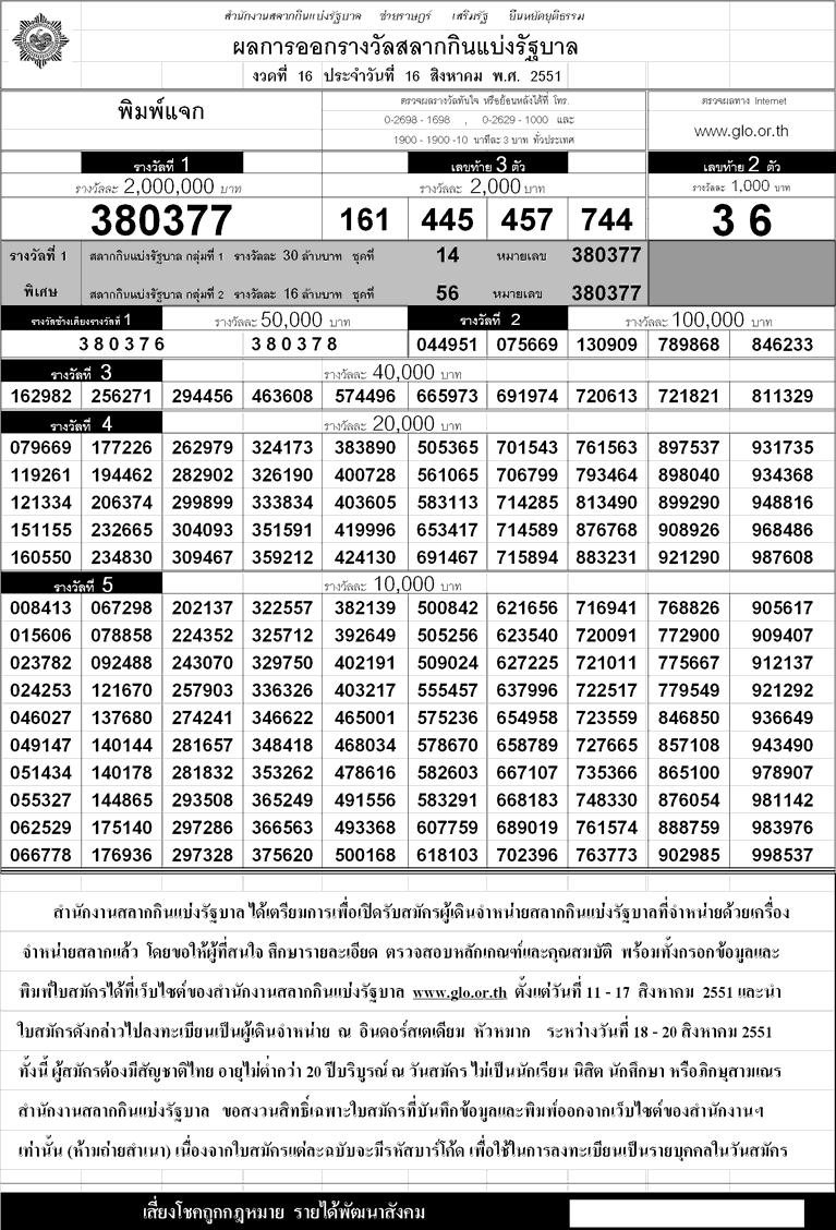 ตรวจหวย ผลสลากกินแบ่งรัฐบาล!!งวด 16 สิงหาคม ปี 2551