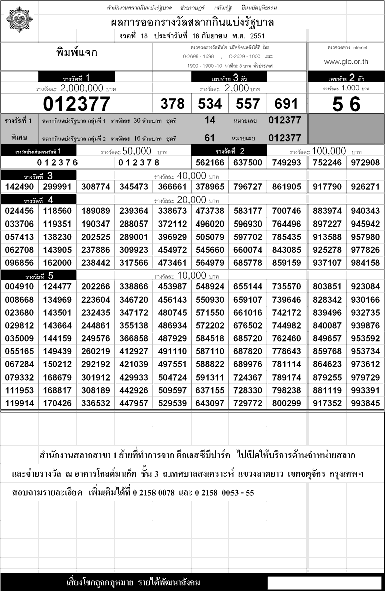 ตรวจหวย ผลสลากกินแบ่งรัฐบาล!!งวด 16 กันยายน ปี 2551
