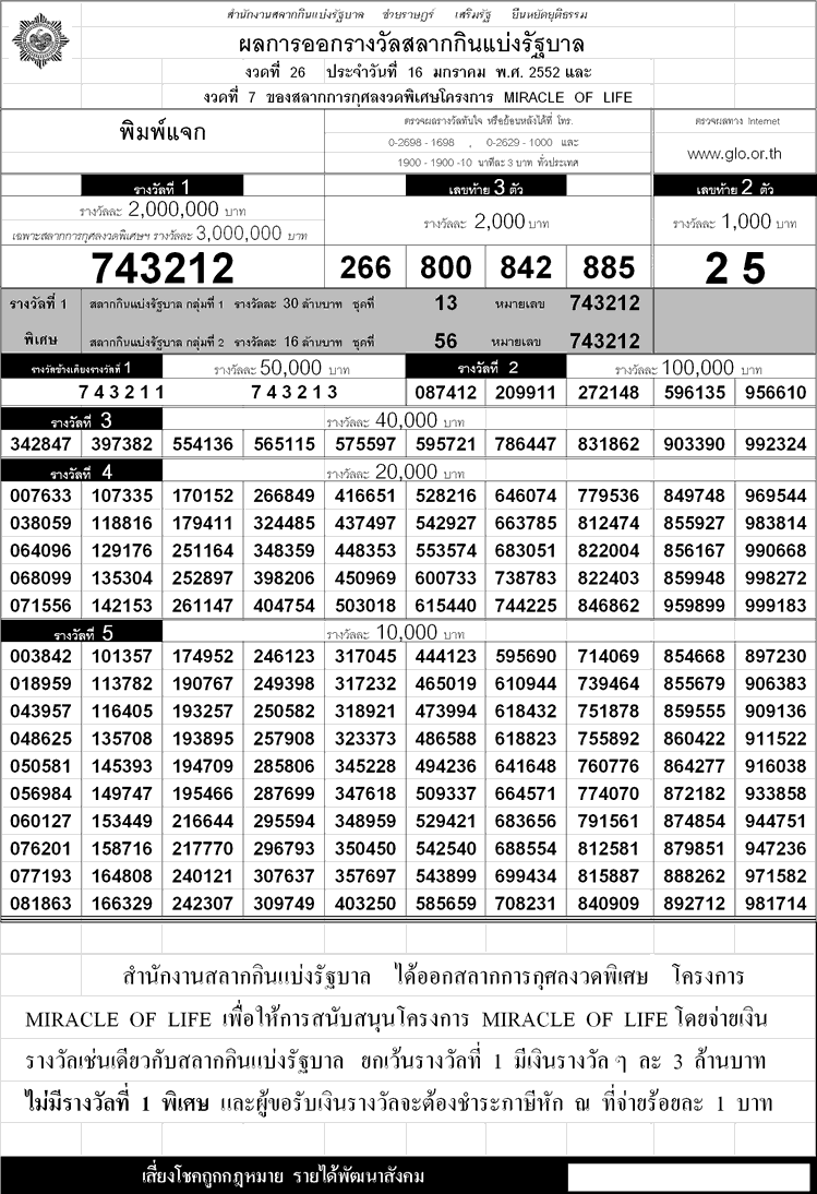 ตรวจหวย ผลสลากกินแบ่งรัฐบาล!!งวด 16 มกราคม ปี 2552