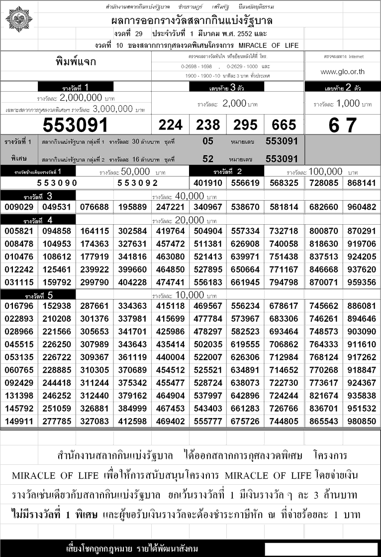ตรวจหวย ผลสลากกินแบ่งรัฐบาล!!งวด 1 มีนาคม ปี 2552