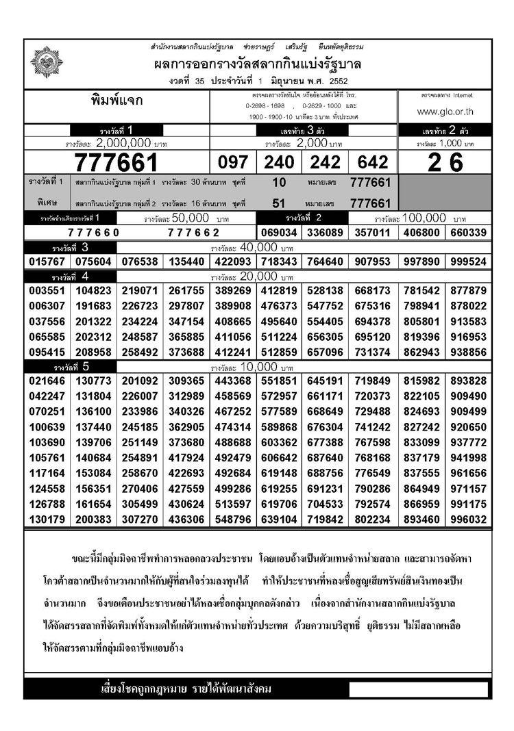 ตรวจหวย ผลสลากกินแบ่งรัฐบาล!!งวด 1 มิถุนายน ปี 2552