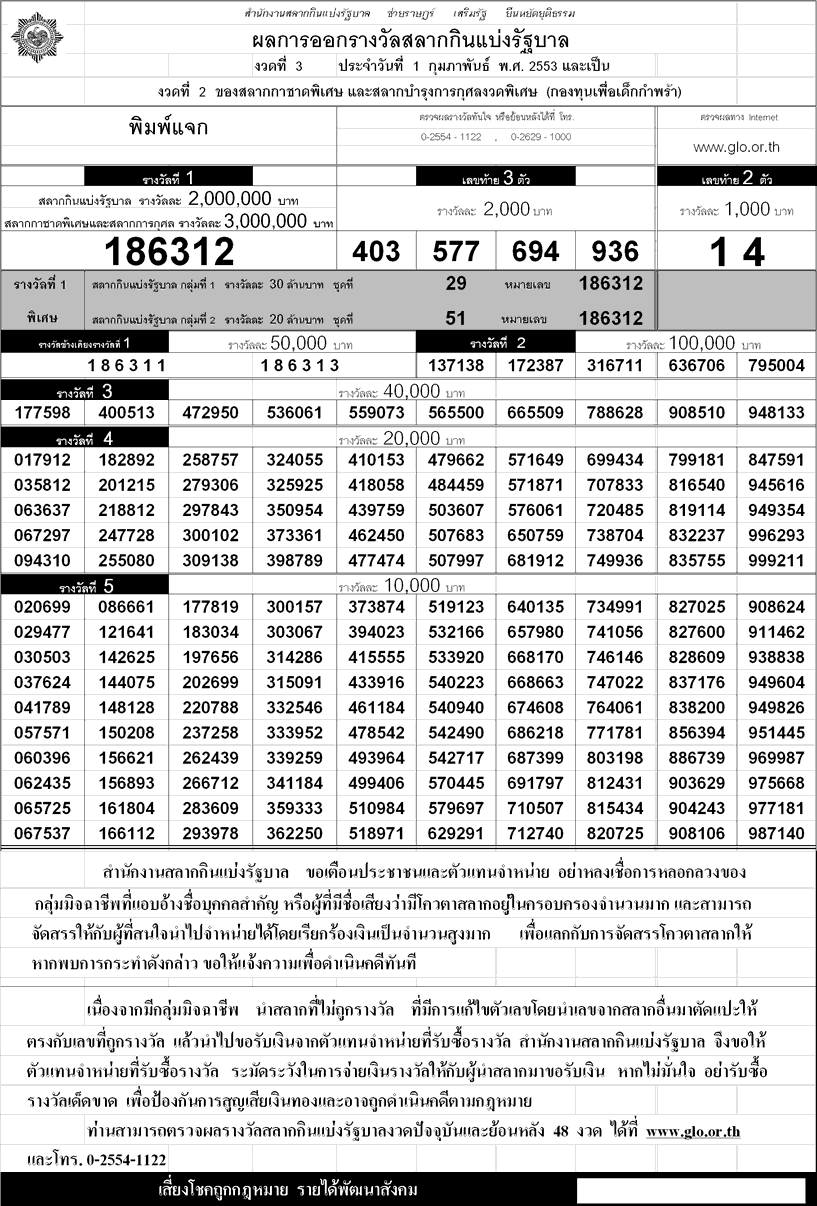 ตรวจหวย ตรวจผลสลากกินแบ่งรัฐบาล 1 กุมภาพันธ์ 2553 ใบตรวจหวย 1/2/53