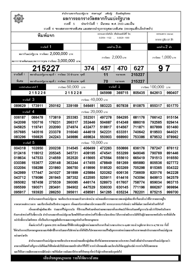 ตรวจหวย ผลสลากกินแบ่งรัฐบาล!!งวด 1 มีนาคม ปี 2553