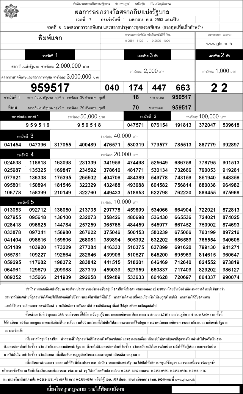 ตรวจหวย ผลสลากกินแบ่งรัฐบาล!!งวด 1 เมษายน ปี 2553