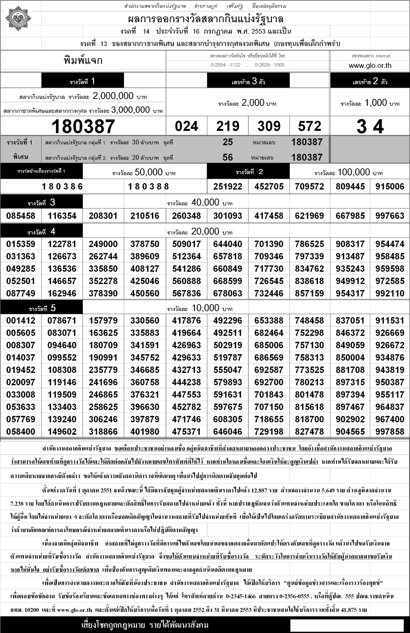 ตรวจหวย ผลสลากกินแบ่งรัฐบาล!!งวด 16 กรกฎาคม ปี 2553