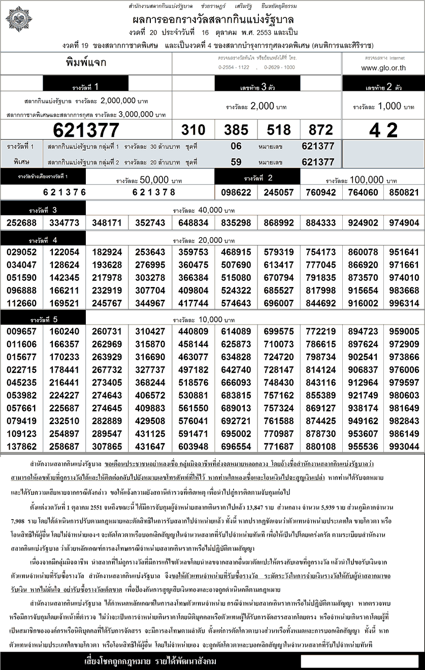 ตรวจหวย ตรวจผลสลากกินแบ่งรัฐบาล 16 ตุลาคม 2553 ใบตรวจหวย 16/10/53