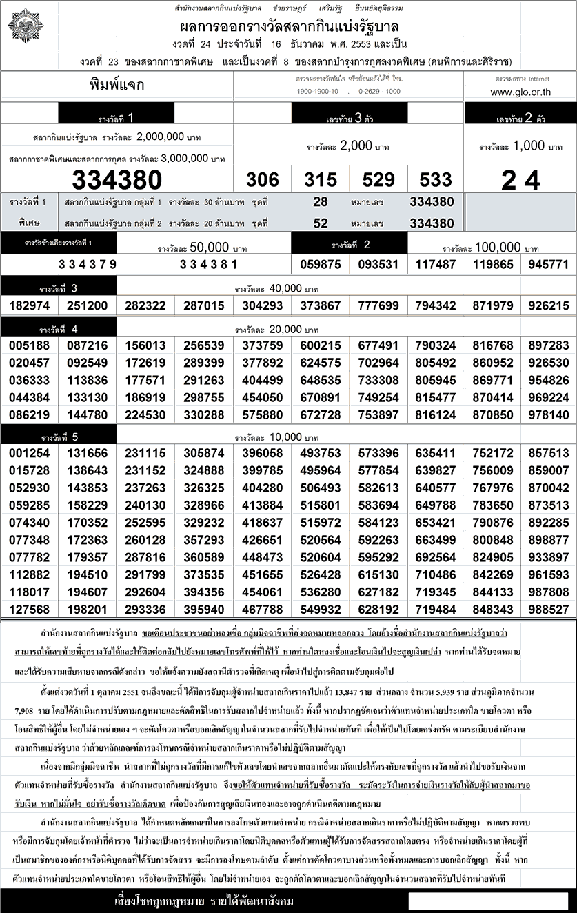 ตรวจหวย ผลสลากกินแบ่งรัฐบาล!!งวด 16 ธันวาคม ปี 2553