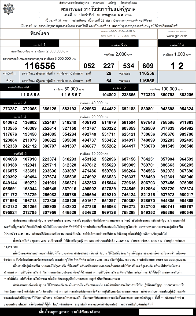 ตรวจหวย ตรวจผลสลากกินแบ่งรัฐบาล 16 กรกฎาคม 2554 ใบตรวจหวย 16/7/54