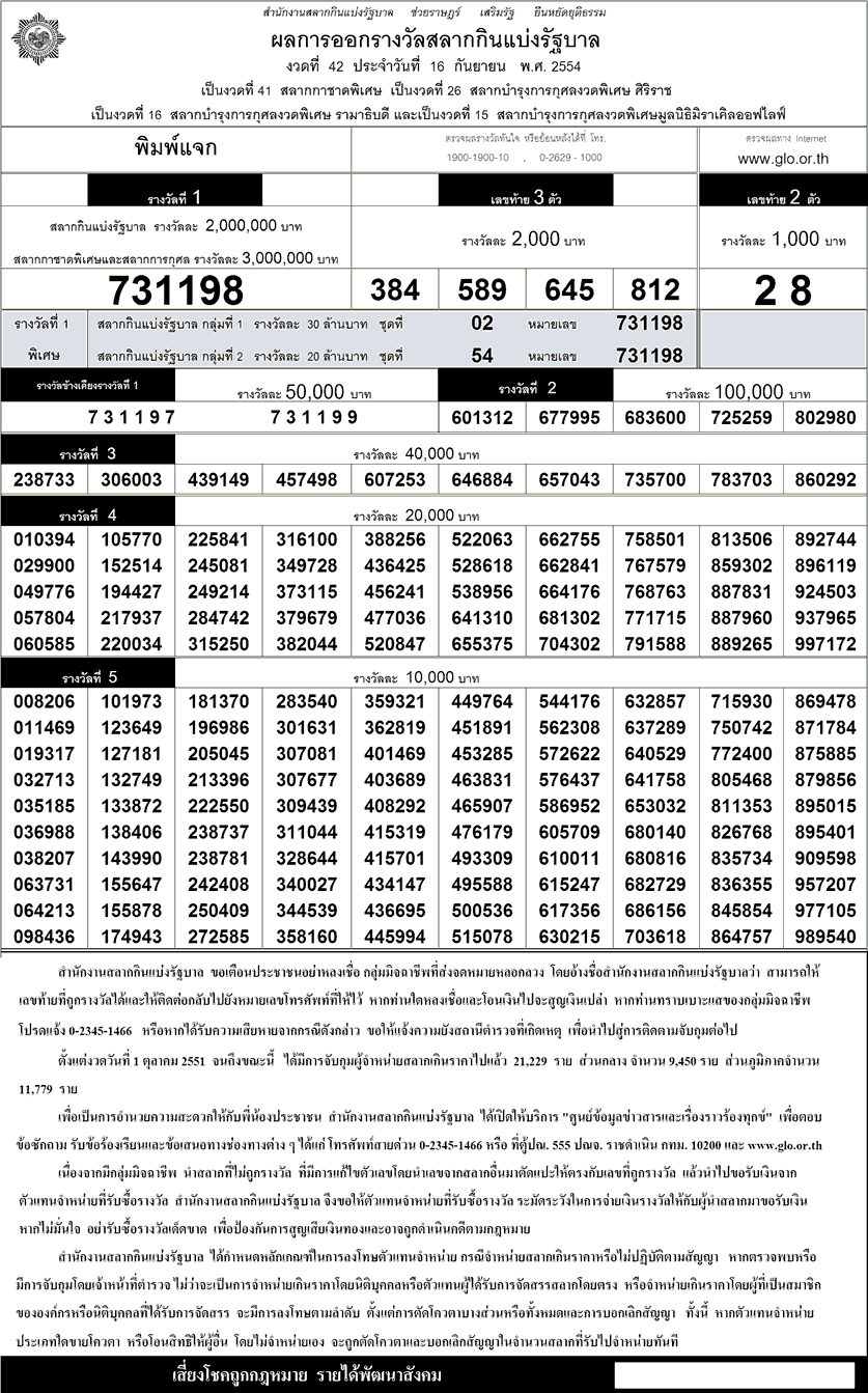 ตรวจหวย ตรวจผลสลากกินแบ่งรัฐบาล 16 กันยายน 2554 ใบตรวจหวย 16/9/54