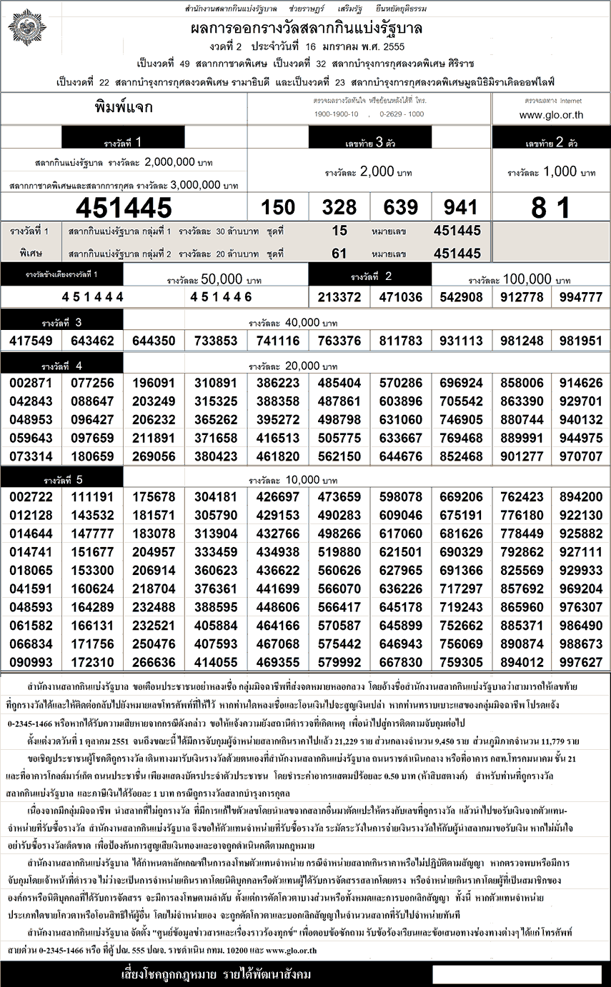 ตรวจหวย ตรวจผลสลากกินแบ่งรัฐบาล 16 มกราคม 2555 ใบตรวจหวย 16/1/55