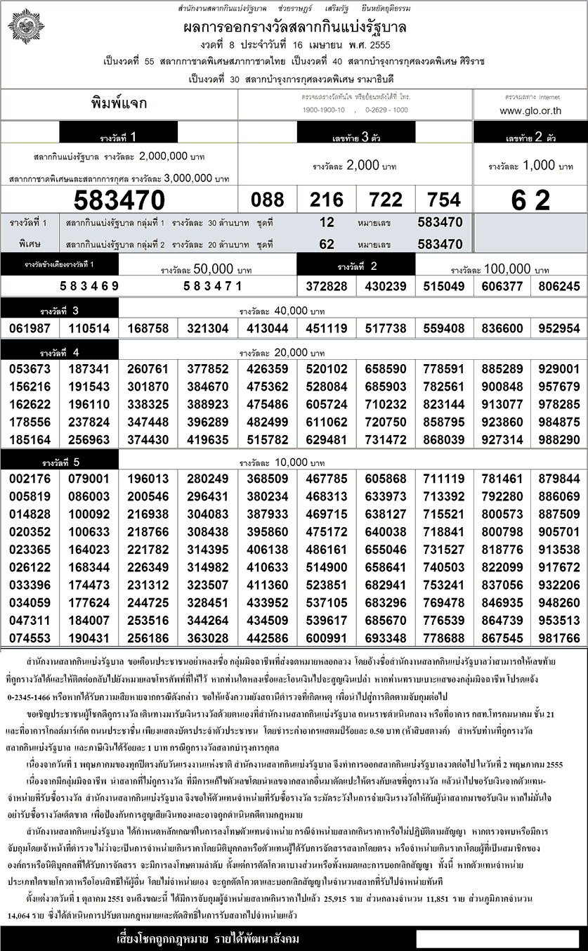 ชื่อเรื่อง:เว็บบริการตรวจผลสลากกินแบ่งรัฐบาลออนไลน์ งวดประจำวันที่ 16/4/55 ตรวจหวย เลขที่ออก 16/04/55