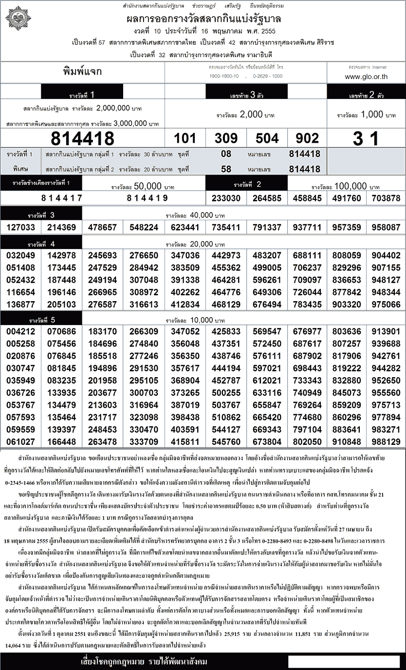 | 01 กุมภาพันธ์ 2557 | ใบตรวจหวย | 180149 | 406 492 888 976 | 95 |