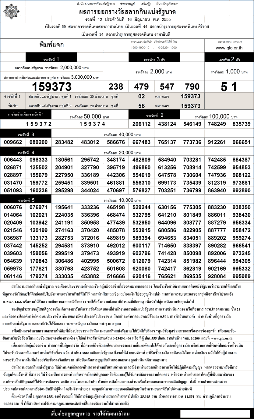 ตรวจหวย ตรวจผลสลากกินแบ่งรัฐบาล 16 มิถุนายน 2555 ใบตรวจหวย 16/6/55