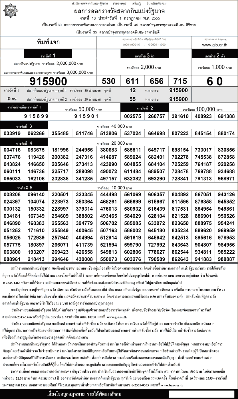 ดาวน์โหลดใบตรวจหวยตรวจหวย สลากกินแบ่งรัฐบาล 1 กรกฎาคม 2555 ตรวจผลสลากกินแบ่งรัฐบาล 1-07-55 ผลสลากกินแบ่งรัฐบาล 1/7/55 ตรวจสลาก ตรวจลอตเตอรี่ รวดเร็วทันใจ หวยออก หวยออกอะไร 1 กรกฎาคม 2555 ใบตรวจหวย 1/7/55