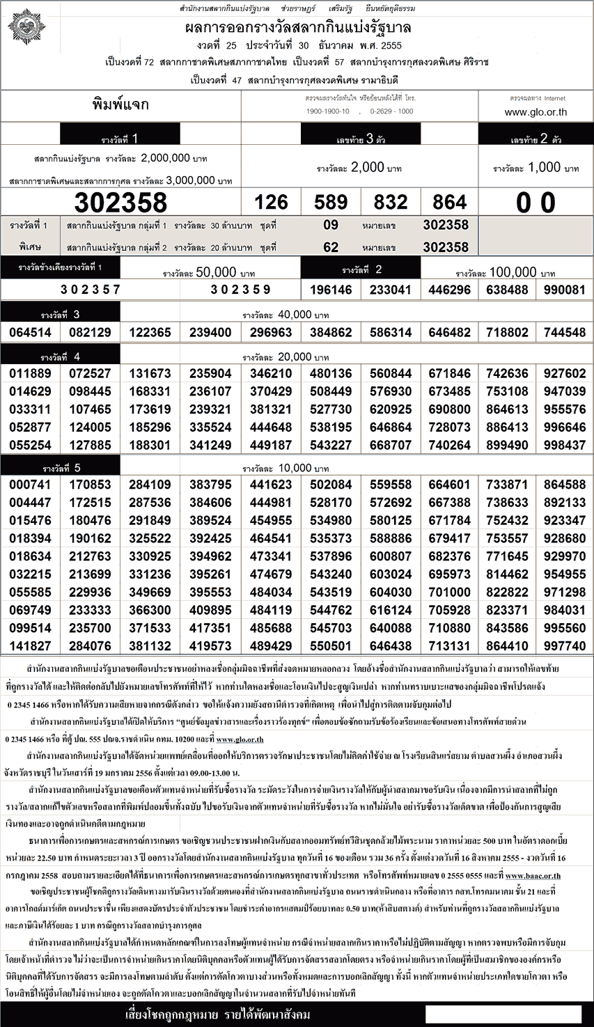 ตรวจหวย ตรวจผลสลากกินแบ่งรัฐบาล 30 ธันวาคม 2555 ใบตรวจหวย 30/12/55
