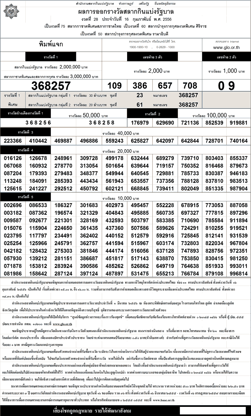 ตรวจหวย ตรวจผลสลากกินแบ่งรัฐบาล 16 กุมภาพันธ์ 2556 ใบตรวจหวย 16/2/56