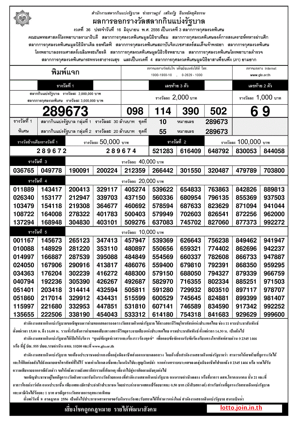 ตรวจหวย ตรวจผลสลากกินแบ่งรัฐบาล 16 มิถุนายน 2556 ใบตรวจหวย 16/6/56