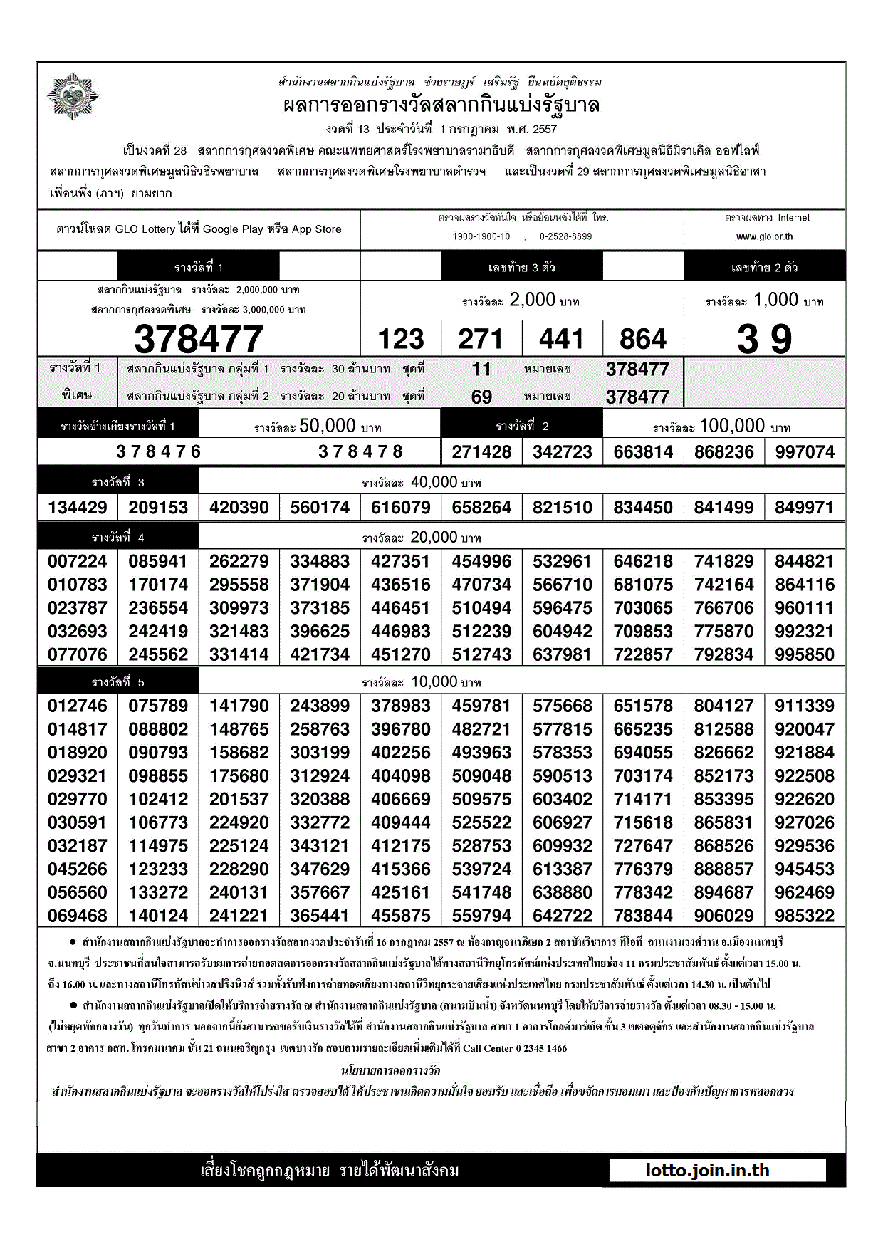 | 01 กรกฎาคม 2557 | ใบตรวจหวย | 378477 | 123 271 441 864 | 39 |