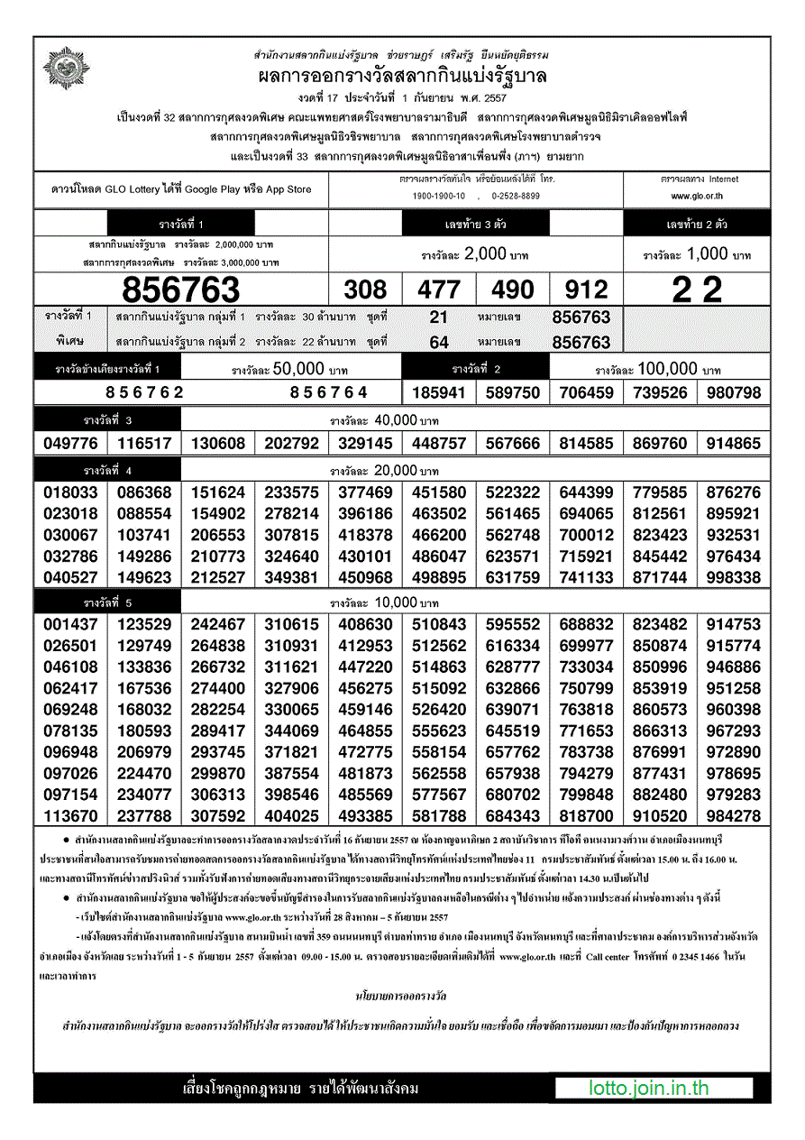 | 01 กันยายน 2557 | ใบตรวจหวย | 856763 | 308 477 490 912 | 22 |