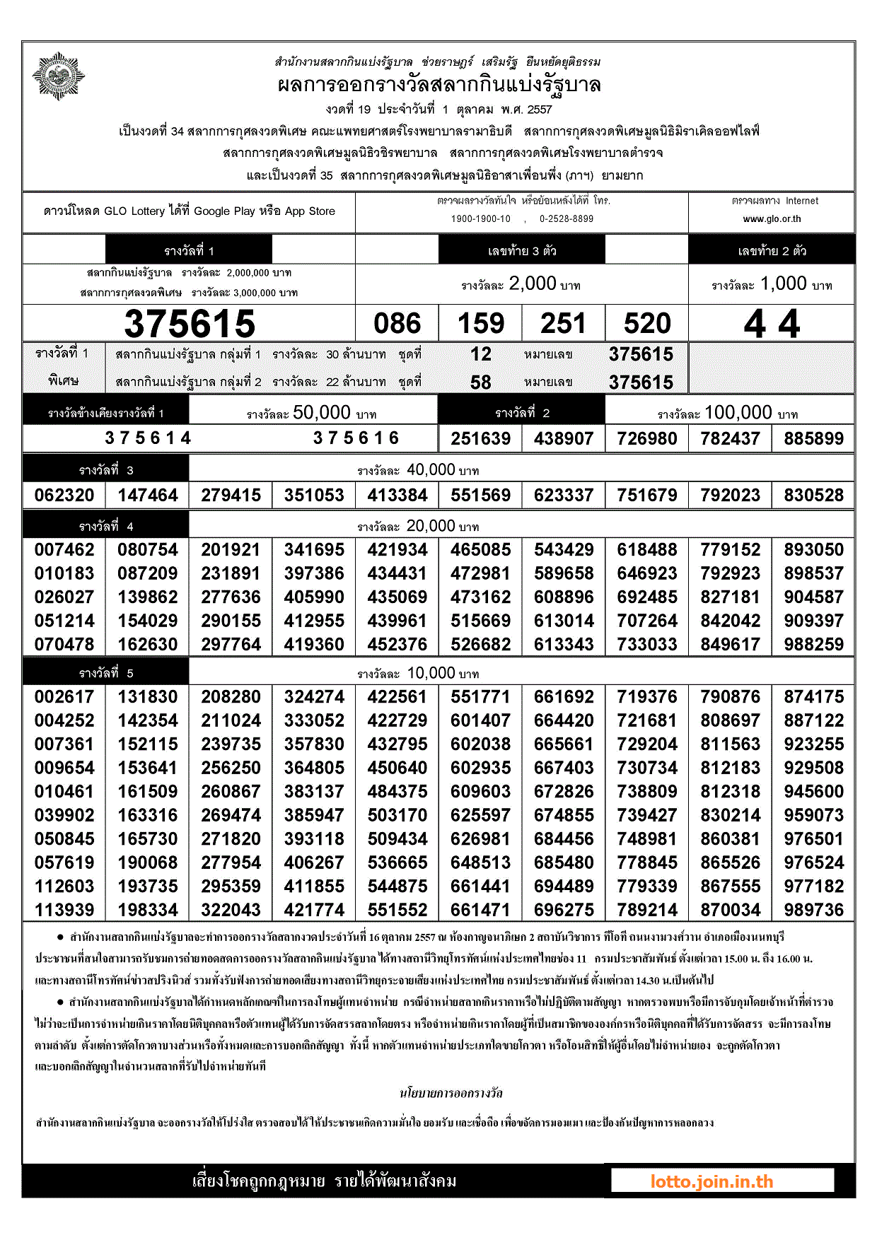 | 01 ตุลาคม 2557 | ใบตรวจหวย | 375615 | 086 159 251 520 | 44 |