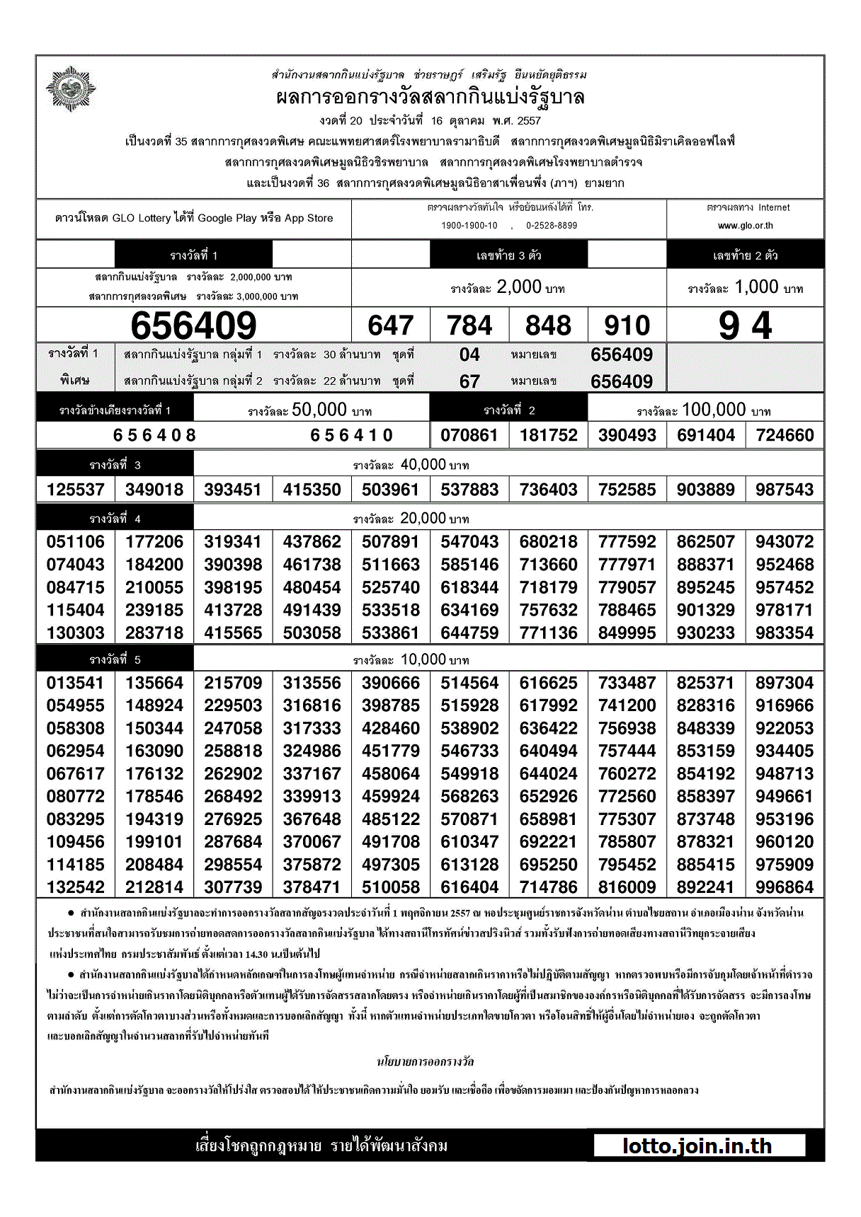 | 16 ตุลาคม 2557 | ใบตรวจหวย | 656409 | 647 784 848 910 | 94 |