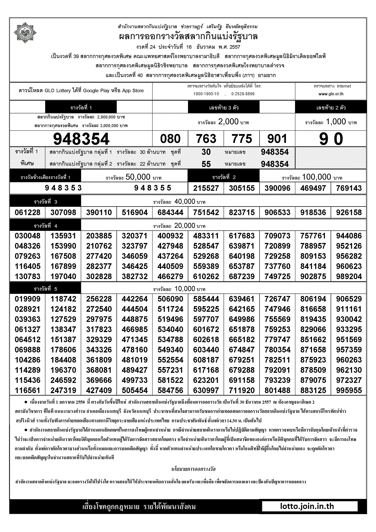 | 16 ธันวาคม 2557 | ใบตรวจหวย | 948354 | 080 763 775 901 | 90 |