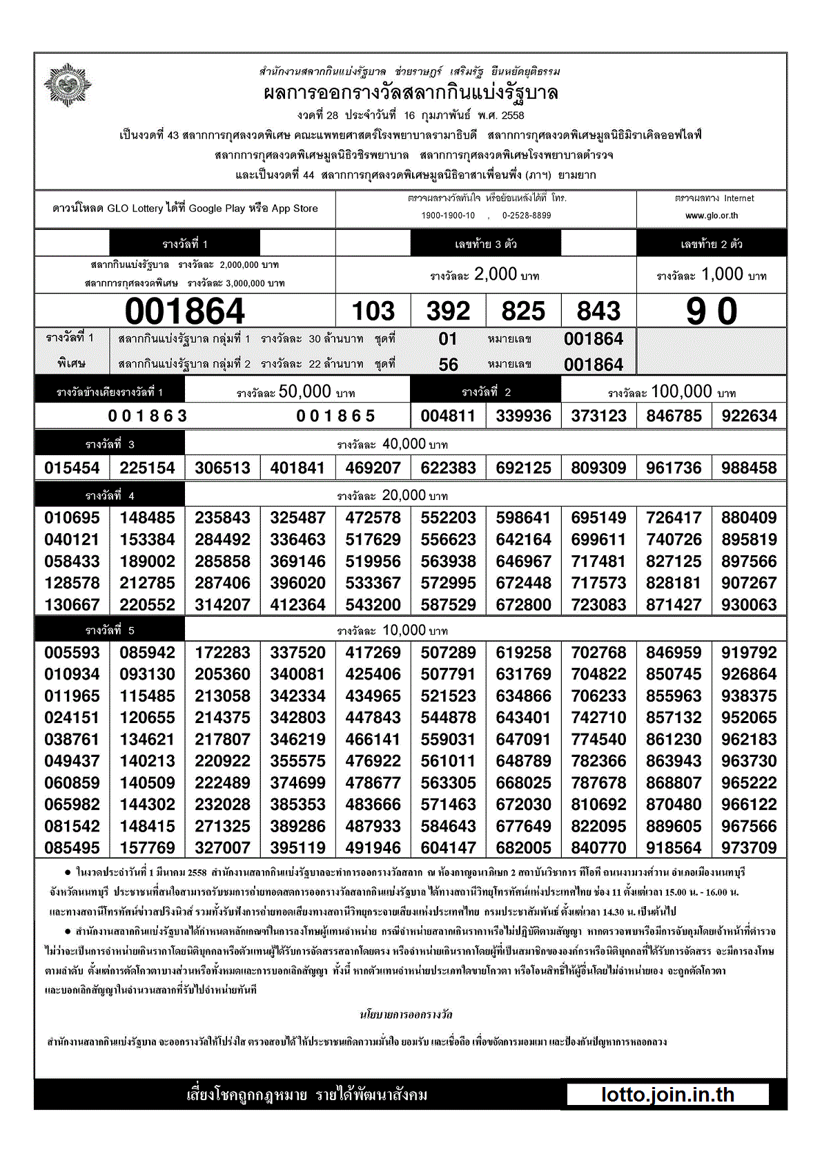| 16 กุมภาพันธ์ 2558 | ใบตรวจหวย | 001864 | 103 392 825 843 | 90 |